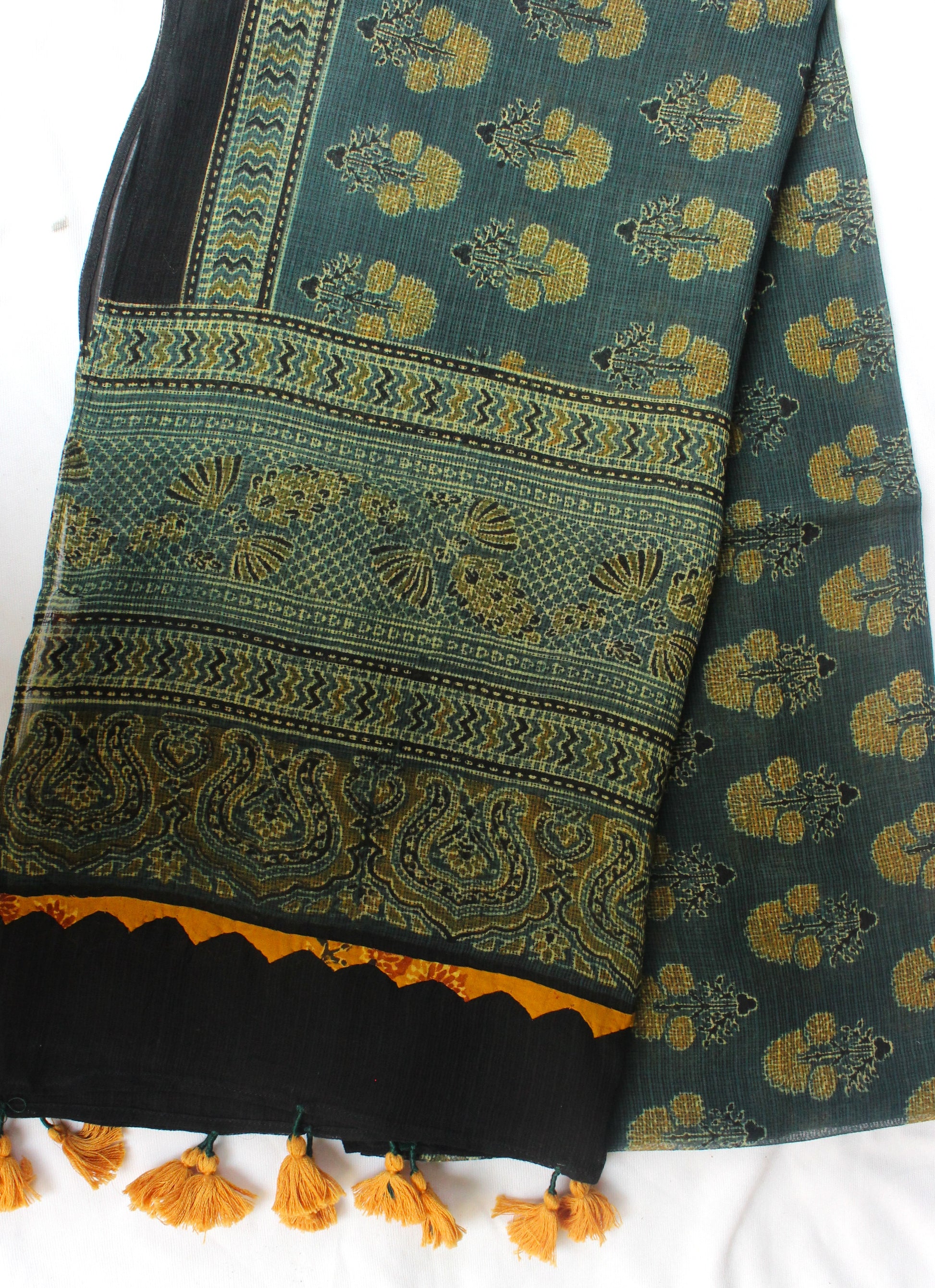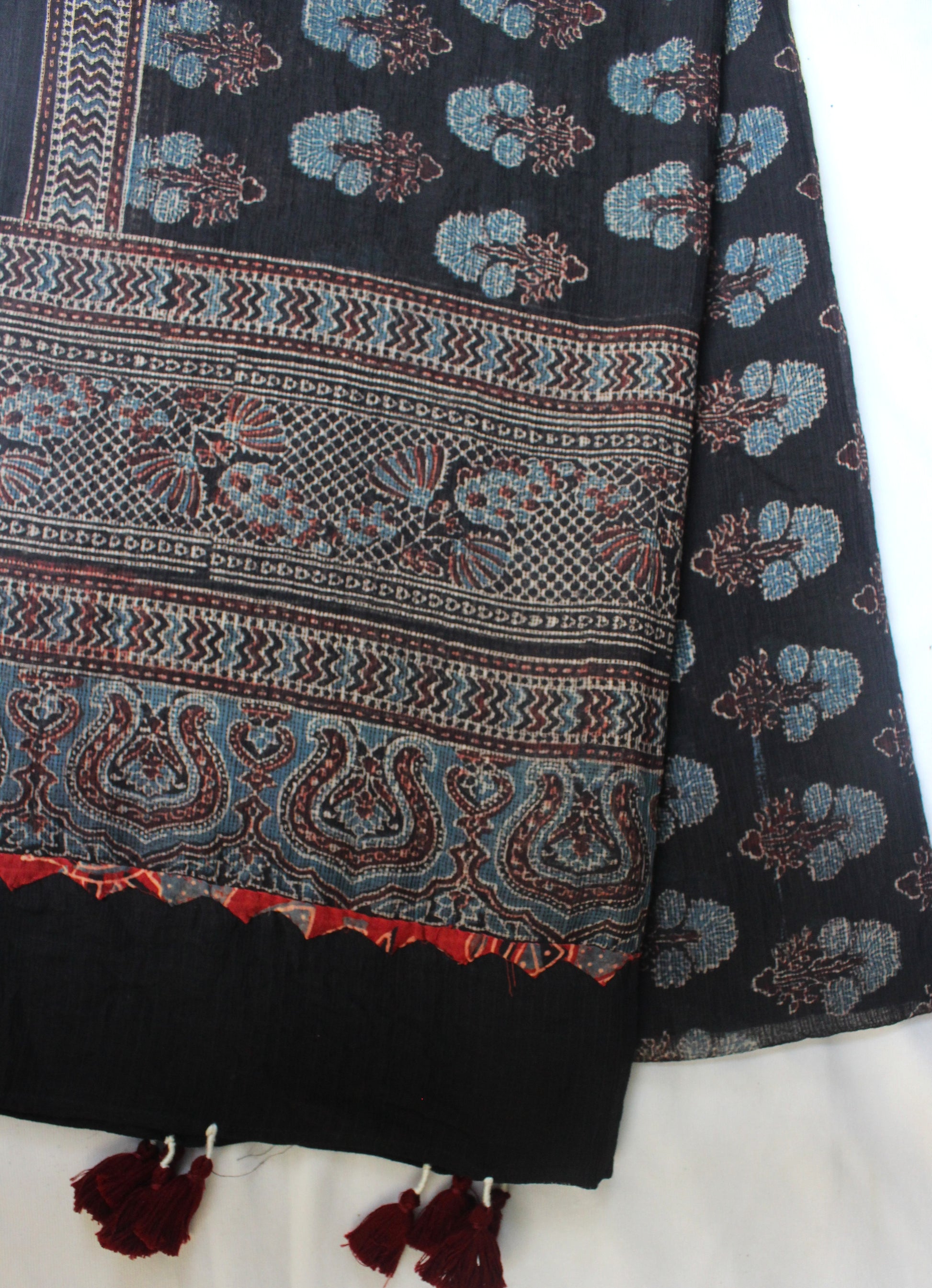 These beautiful Kota Doriya stoles are crafted from soft, breathable cotton and adorned with traditional Ajrakh prints. Each piece is finished with intricate Appliqué Kangura detailing and elegant tassels.