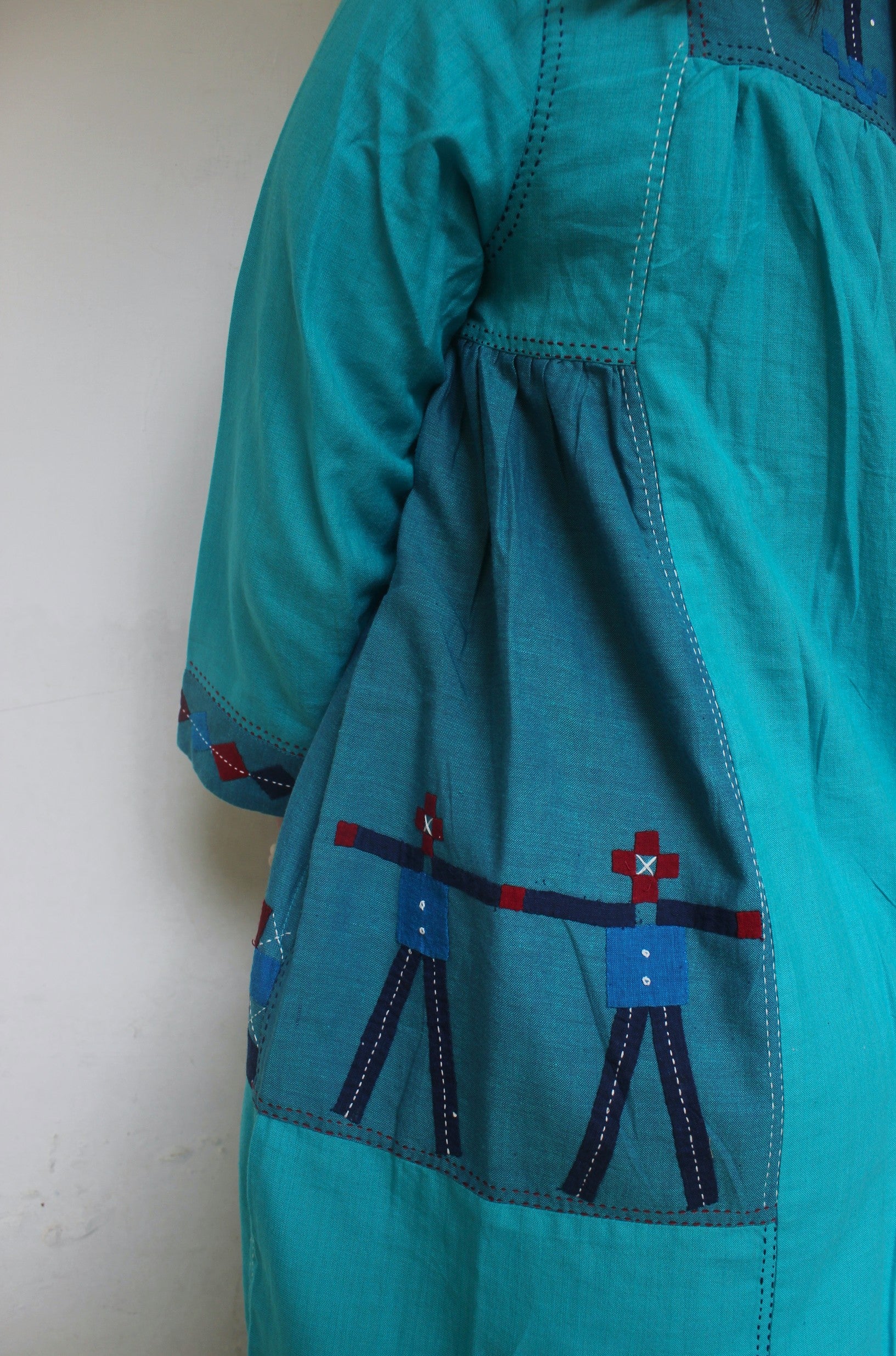 Step into contemporary elegance with this sky blue cotton kurta, where modern art meets traditional craftsmanship. The kurta features intricate appliqué detailing, showcasing artistic motifs and a unique human-inspired design that tells a story with every thread.