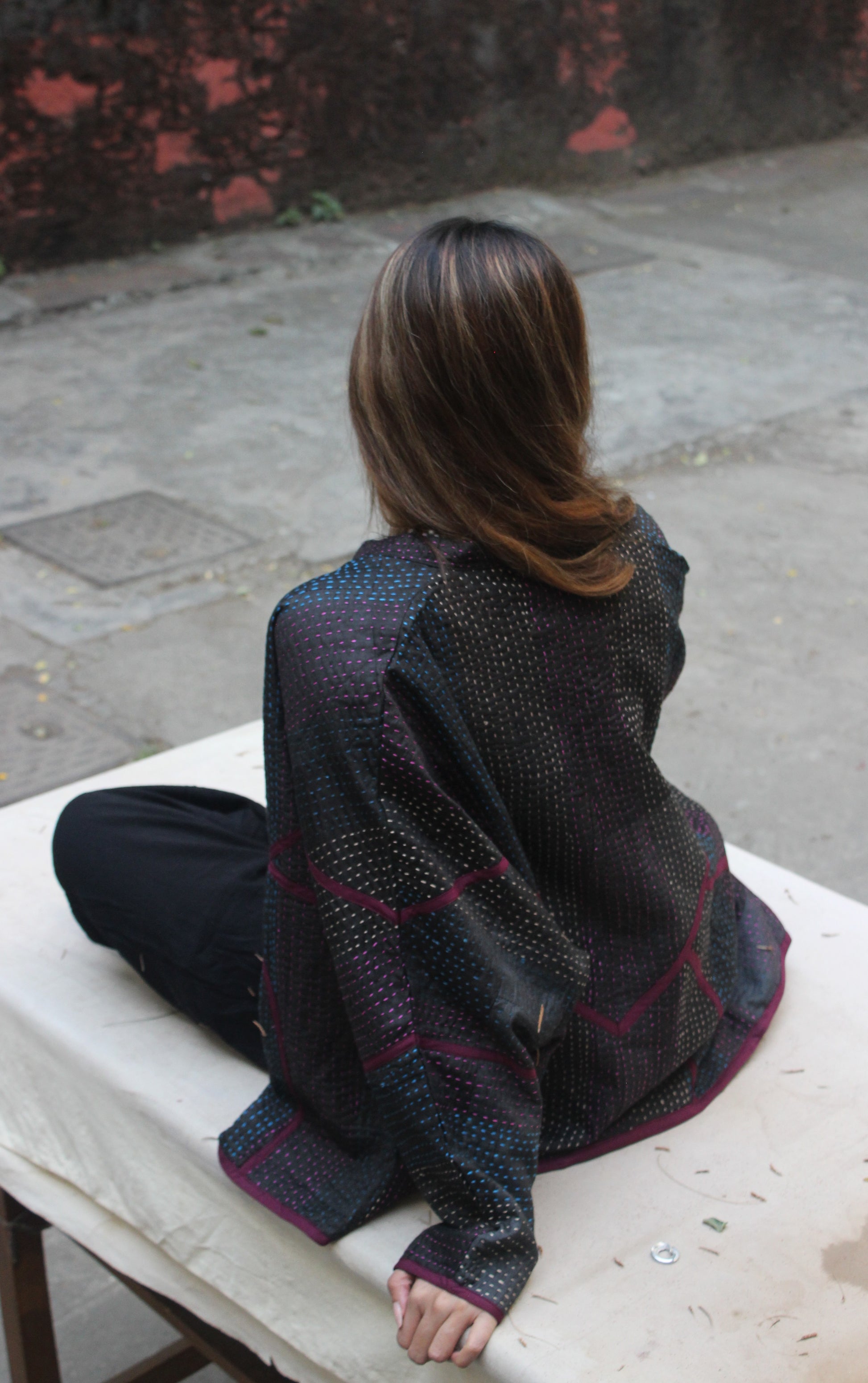 Stay warm and stylish this season with our Silk Winter Jacket, meticulously handcrafted by skilled Indian artisans. Made from pure silk fabric patches in rich, lustrous black hues, this handmade patchwork jacket is a true expression of heritage craftsmanship and modern luxury. Each patch is joined using fine Tanka embroidery in beautifully contrasting thread colors, adding texture and artistry to the design.